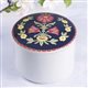 Smykkeskrin til bunadsølvet. Dekoren på lokket er hentet fra jakka til Øst-Telemark bunaden og dekoren rundt skrinet er fra skjorta. Det indre skrinet er lufttett og i tre etasjer. Sølvet holder seg blankt og fint i lang tid. Skrinet rommer alle smykkene til din bunad. Ytre mål: d 14 cm – h 11 cm.