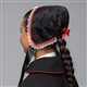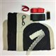 Komplett Materialpakke til å sy lue til Vestfold Husflidslag kvinnebunad1956 modell i sort. Den sorte lua har rød silkesløyfe midt bak. Luen har hvit knipling eller blonde og svarte knytebånd.