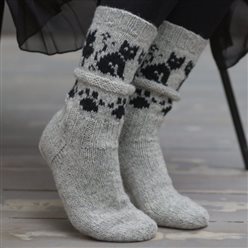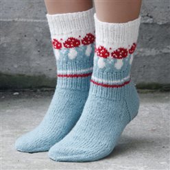 Hyttesokker strikkes i Fjord sokkegarn. Garnpakken inneholder oppskrift og garn nok til største størrelse.