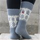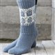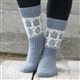 Størrelse: 26/30 – 34/35 – 38/39 – 43/44. Pinneforslag: strømpepinner 2,5 og 3 mm. Sokkene er her vist i fargene lys blågrå 03545 og ubleket hvit 03100.
