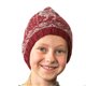 Lue og votter til barn strikkes i fargene naturgrå 652115 og burgunder 652104.