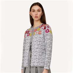 Lang jakke med mønster inspirert fra blomsten julerose. En avslappet og elegant jakke, med krage og lommer, som med sin lengde og dens myke merinoull og silke blanding, er perfekt til vårens og sommerens klima.