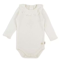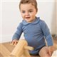 Ullbody med krave i den mykeste merinoull som er kløfri og myk mot huden. Bodyen er kjempesøt under andre plagg, eller kan brukes som en tynn genser. Den har trykknapper bak i nakken og i skrittet.