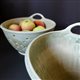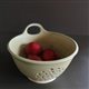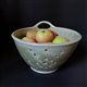 Ingen hull i bunnen gir tørr bolle på bordet. FRUKTbar er større enn BÆRbar. Hånddreid i steingods og glasert med en matt glasur med fint spill i grønt. Alle vil ha noe ulikt hullmønster.