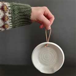 SLEIVrast fra ingridk, lava. Hånddreid i steingods, med blank glasur over en rustikk spennende leire. Med lærsnor for å kunne henges opp.
